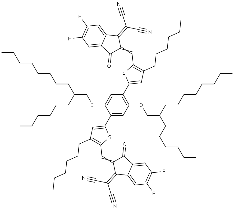 中文名稱:2,2'-((5,5'-(2,5-雙((2-己基癸基)氧基)-1,4-亞苯基)雙(3-己基噻吩-5,2-二基))雙(甲川))雙(5,6-二氟-3-氧代-2,3-二氫-1H-茚-2,1-二亞基))二丙二腈